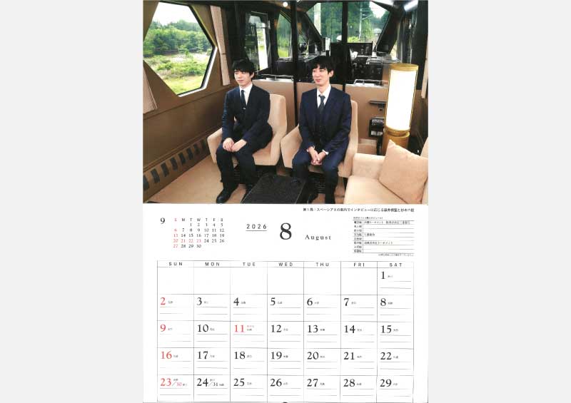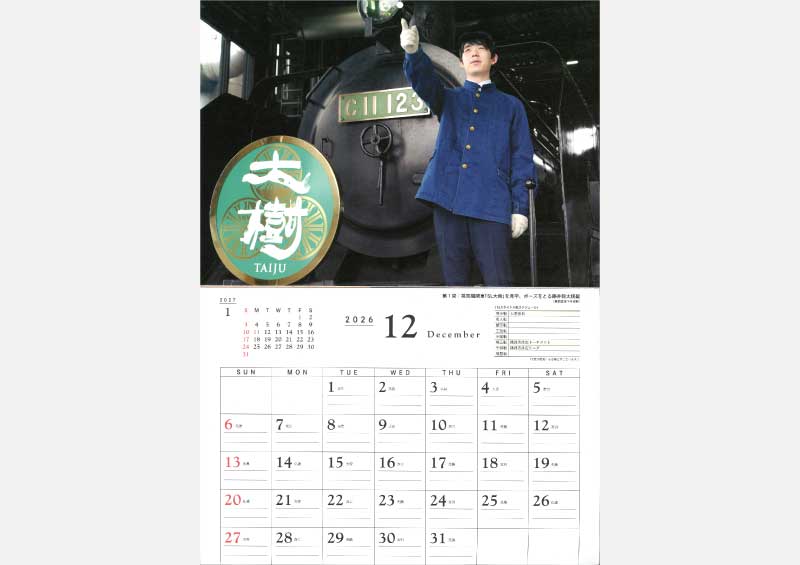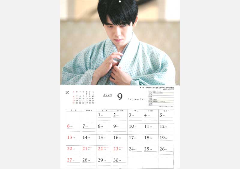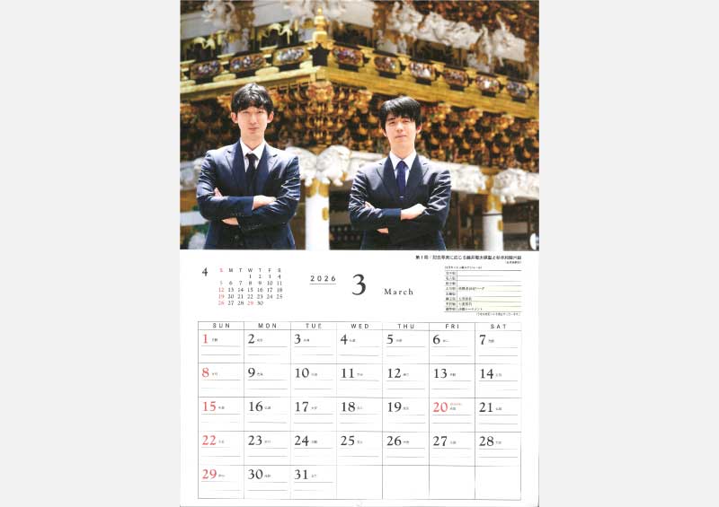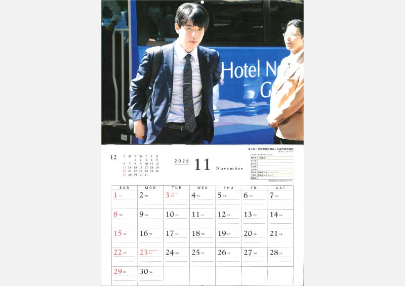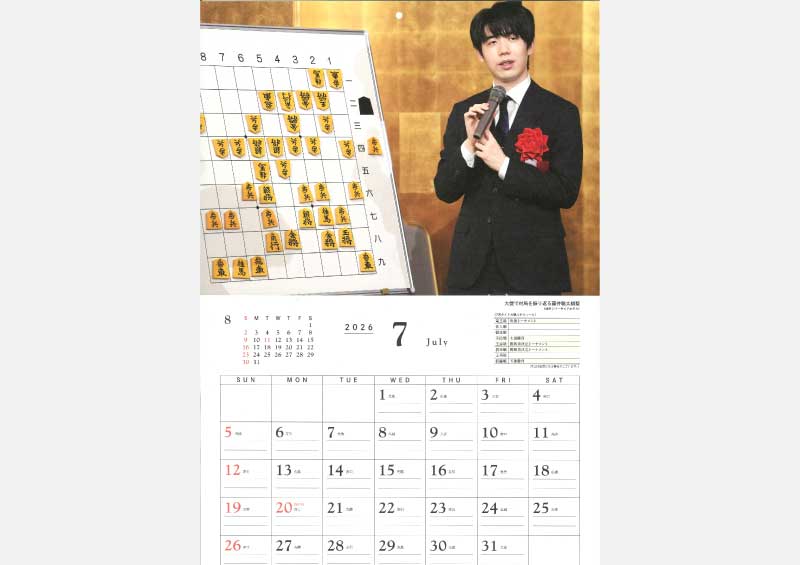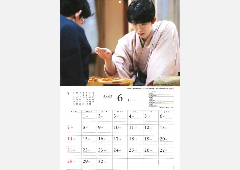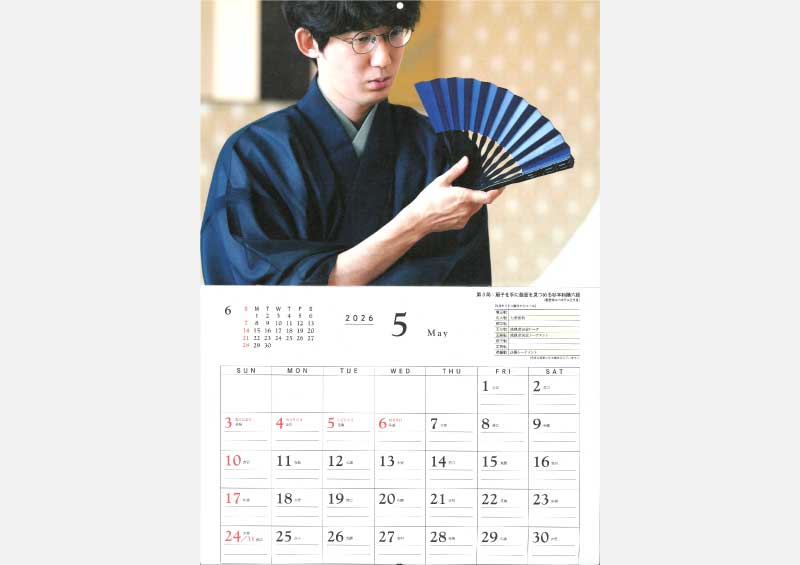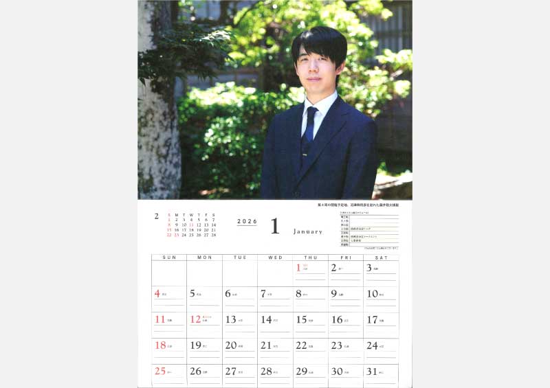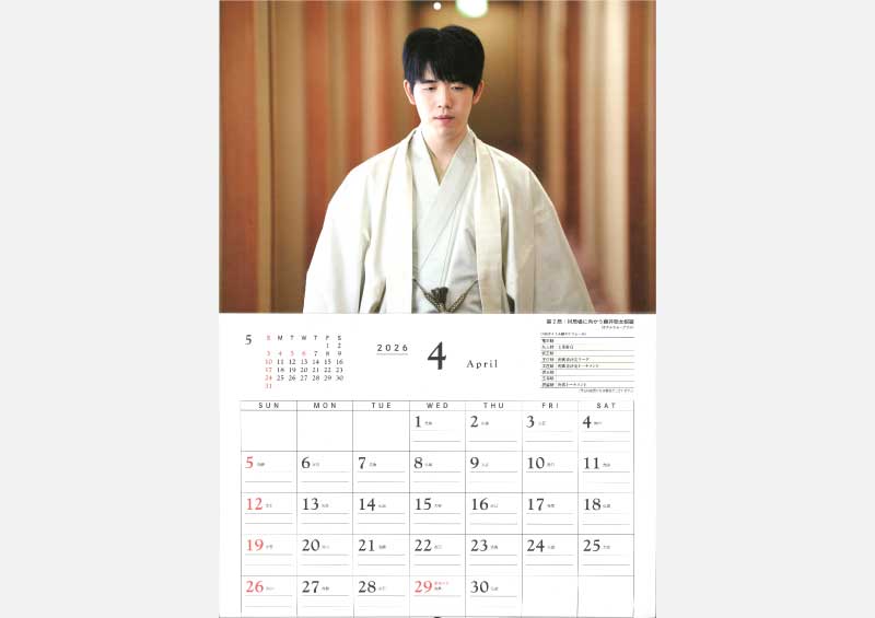 昨年には通算5期獲得により、自身初となる永世称号の「永世棋聖」を獲得しました。1971年に中原誠名誉王座が棋聖戦で打ち立てた永世称号獲得の最年少記録を53年ぶりに更新しました。令和8年のカレンダーではリモートカメラなどで撮影した対局風景や、第1局を終え東武鉄道のスペーシアXの車内インタビュー下今市駅を訪れ「SL大樹」の見学を楽しむ光景など15枚を「盤上の物語 ヒューリック杯第96期棋聖戦 藤井聡太棋聖VS杉本和陽六段」カレンダーに仕立てました。