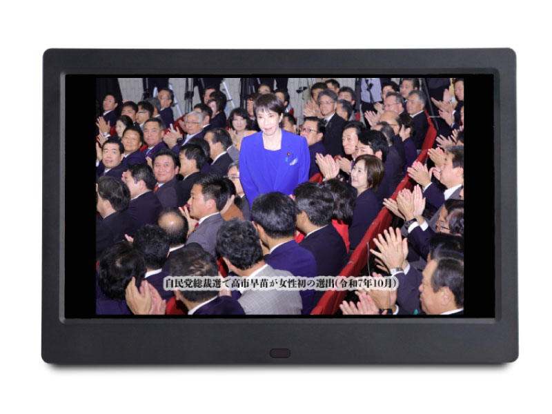 フォトフレームはデジタル機器メーカー「aiwa」と産経新聞出版が共同制作。大正末期の街の風景から、226事件、真珠湾攻撃、学童疎開などの戦前戦中、シベリア引き揚げや集団就職、東京オリンピックなどの高度成長期、さらに昭和64年の「昭和最後の日」や震災、コロナ禍、初の女性首相となる高市早苗総理誕生まで昭和100年間の光と影を約600枚の写真で描きます。各種スポーツの名場面も収録されています。