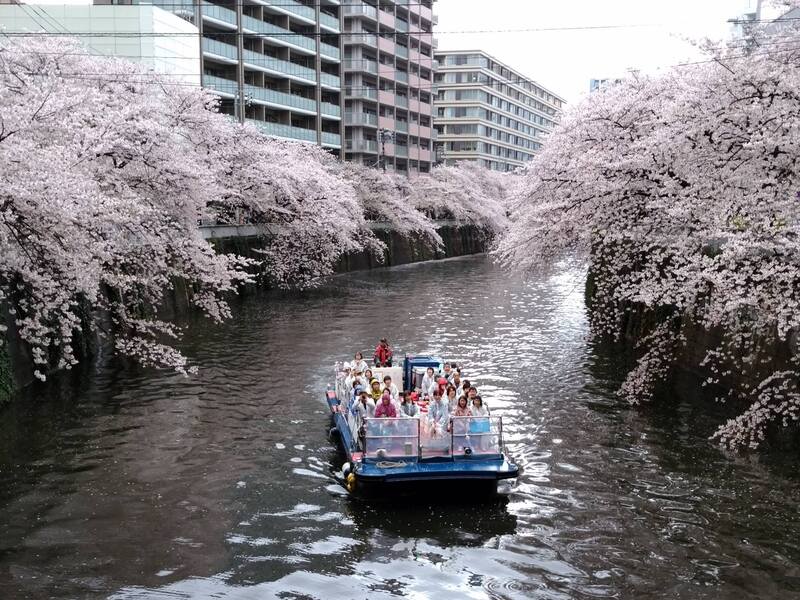 ①川幅が狭く臨場感あふれる目黒川沿いの桜のお花見には小型オープン船がぴったり!